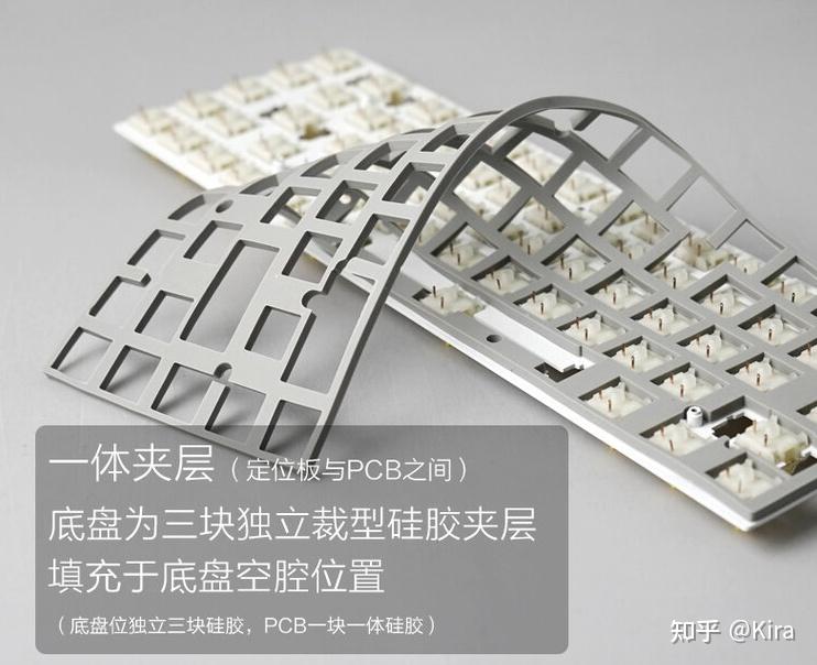 而随着 2021 年末 Keychron Q1、黑爵 AC081、达尔优 A98 等 Gasket 键盘的上市,拉开了近两年 Gasket 浪潮的宏大序幕,时至今日 Gasket 结构占据了 80% 以上的国产键盘。Gasket 直译为垫片,顾名思义,Gasket 结构是外壳通过棉条、硅胶等垫片夹住内胆实现固定,即内胆与外壳之间不存在任何刚性接触。