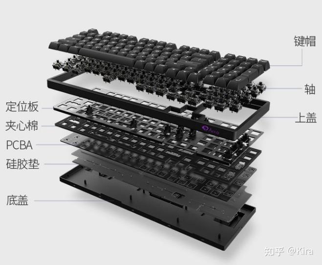 机械键盘一般由外壳、内胆、轴体、键帽、消音填充五部分组成,其中定位板、PCB 等属于内胆,而键盘结构指的是内胆与外壳的固定方式。