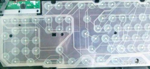 薄膜键盘的按键结构由橡胶帽和触发开关组成。橡胶帽位于键帽下面,普遍为硅胶材质,因此薄膜按键的手感普遍偏软,而且容易软塌。橡胶帽下方就是触发开关,由三层薄膜组成:导电层 - 绝缘层 - 导电层,每个按键在绝缘层上都有对应的小孔。当按键被按下时,上下层薄膜将通过这些小孔接触产生电信号,从而主控芯片能够得知是哪个按键被按下。