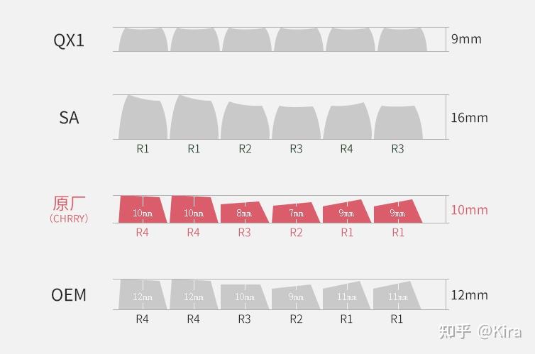 常见的键帽高度有原厂、OEM、SA、DSA、XDA 等,其中量产键盘大部分都采用的是原厂和 OEM 高度的键帽,少部分也会采用 QX1、XDA、DSA 等高度的平胸球帽。