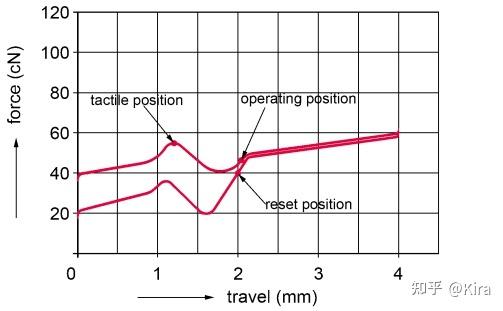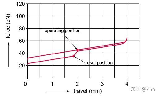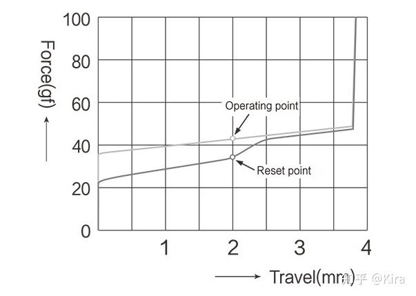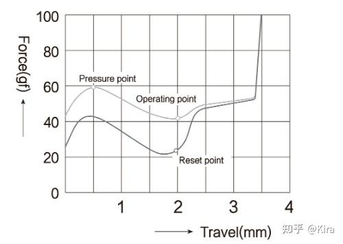 在机械轴的物理属性中有一个参数为触发压力,其指的是按键按下直至发生信号所需的力度,即其实并非需要把按键完全按到底才能触发按键信号,具体压力值对应的是行程图上 operating point 的 x 坐标。