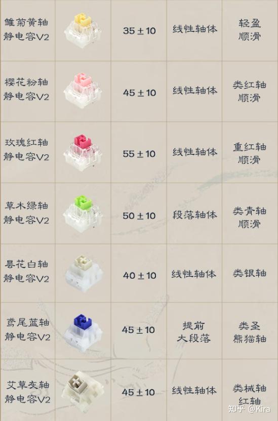 阿米洛目前已经推出共 8 种静电容轴体:雏菊黄、樱花粉、玫瑰红、草木绿、昙花白、鸢尾蓝、艾草灰、紫罗兰,各轴体具体参数如下图表:
