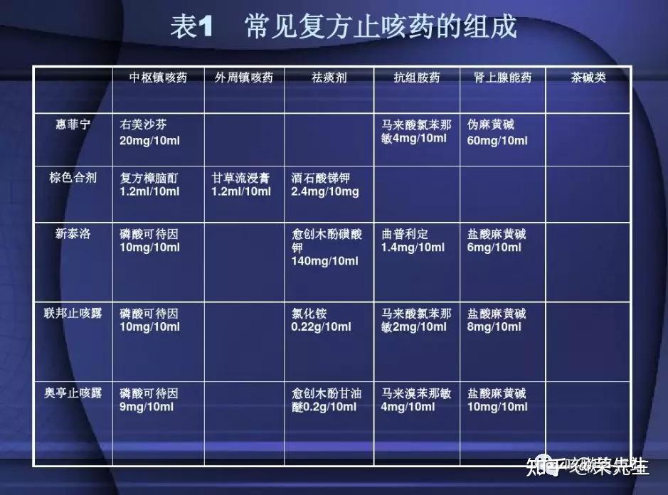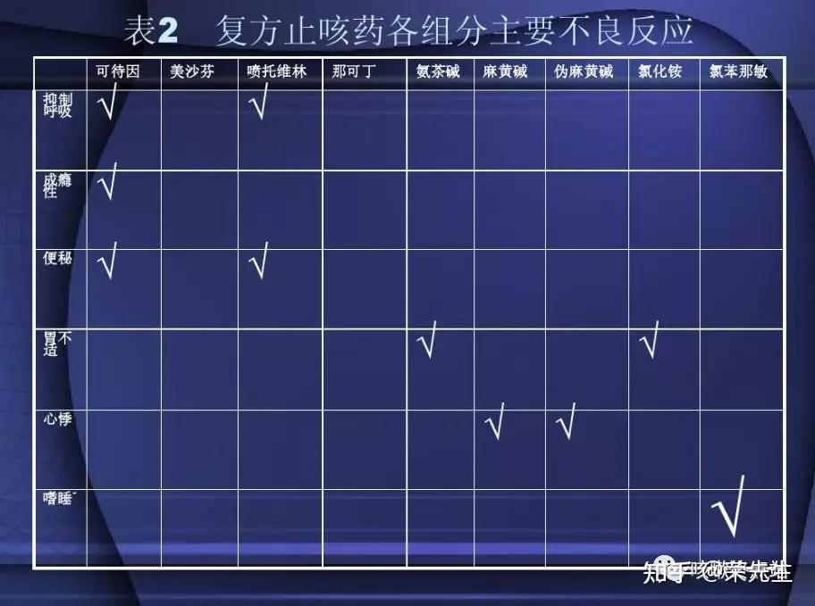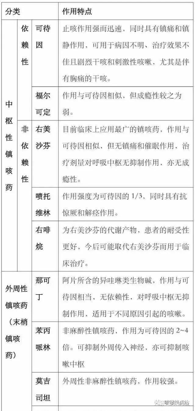 1、可待因:止咳作用强而迅速,同时具有镇痛和镇静作用,可用于病因不明、治疗效果不佳且剧烈干咳和刺激性咳嗽,尤其是伴有胸痛的干咳。