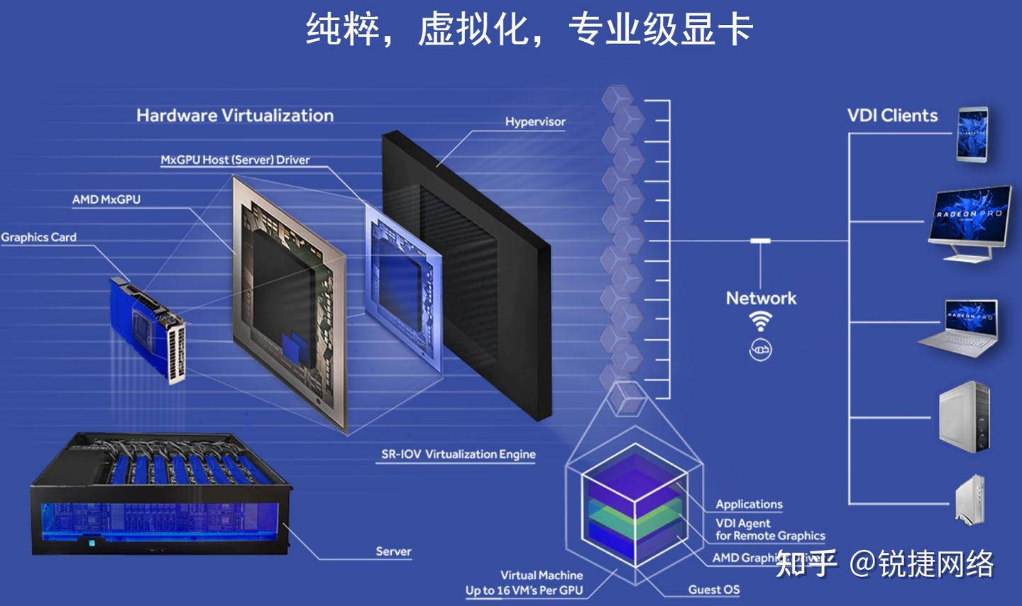AMD MxGPU是全球首个基于硬件的vGPU解决方案,以PCIe标准中定义的SR-IOV(单根I/O虚拟化)技术为基础,实现每个物理GPU上有多个虚拟化用户远程工作。AMD MxGPU技术特点有