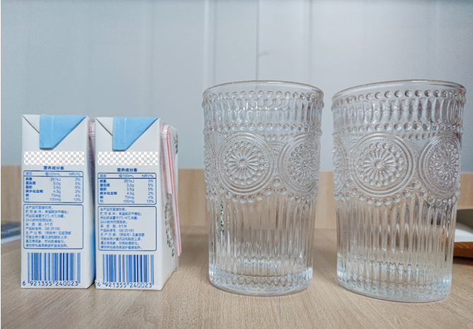 从早餐库存里翻出两盒250ml的牛奶,把它们倒进两只一模一样的杯子,分别用普通微波炉、变频微波炉选定40%火力、定时1分钟加热。(技术部的小哥哥说这个设定能非常清楚地展现两者的差别,火力全开没一会儿就都热好了,不好展示定频的均匀火力!)