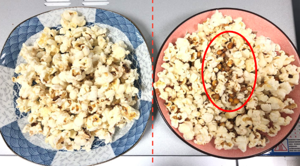 此时,变频微波炉的爆米花已经完全爆开了,而普通微波炉没完全爆开的。变频微波炉的优势可以说是十分明显了!