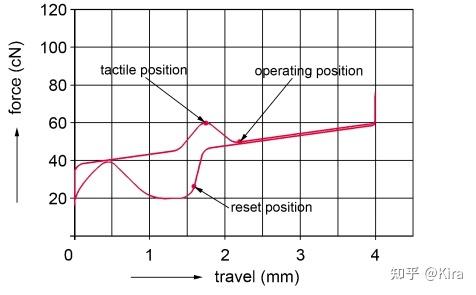 对于刚入坑机械键盘的新手而言确实如此。 绝大部分朋友入坑机械键盘前接触的无论是笔记本键盘还是几十块的普通键盘,其实都是薄膜键盘的一种,薄膜按键的手感源自于键帽下胶碗的形变,如下压力曲线图(暂时找不到薄膜按键的压力曲线图,先以同样胶碗设计的压力曲线非常相近的静电容轴作为参考),手感变化是一个先重后轻再重的过程,且压力曲线非常圆滑,在敲击时并不会感到任何突兀感。