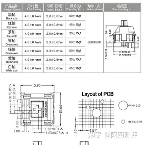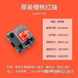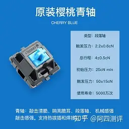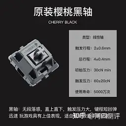 2. 轴体: 作为一个键盘的核心,直接决定了手感和声音,轴体可以分为线性轴(如传统的黑,红轴)和段落轴(青,茶轴),线性轴的手感就是那种直上直下的,段落轴的手感会有一个“咔哒”的段落手感。 轴体的品牌众多,手感也各有特色,首先介绍的是著名的德国Cherry轴体,也叫樱桃轴,原厂轴,常见的轴体有(黑,红,茶,青,银)