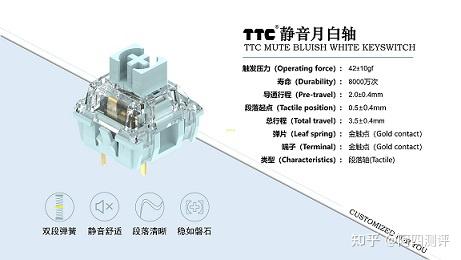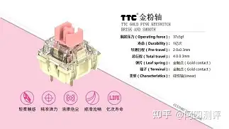 ③TTC: TTC轴是惠州市正牌科电有限公司旗下的轴体,与凯华、佳达隆轴并称为"国产轴体三巨头"。之前是专业做代工的,随着樱桃轴的专利到期,开始转型做自研轴体,轴体的质量与水准,可以说是近几年国产自研轴体的天花板。 TTC轴主要分为金粉/月白/金红/金茶/兄弟/西瓜奶昔/赤瞳ACE/晴空/烈焰红/快银共10种。这里重点介绍金粉,月白,快银。 金粉轴: 金粉轴的特点是稳定、回弹有力、按压轻柔顺滑,作为TTC的成名轴体,带动了整个轴圈用加长弹簧来换取高回弹,手感确实独一无二