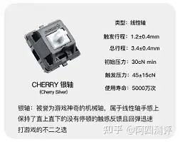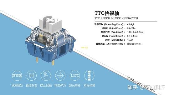快银轴: 个人认为,TTC快银轴是目前市面上最适合打游戏的轴体,轻触发压力、短键程、回弹强劲快速、顺滑的线性轴