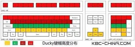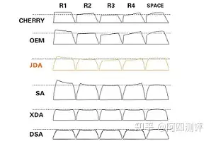 3. 键帽: 键帽除了最基本的颜色特征外,还有以下几个细节: ①:键帽材质 键帽材质主要分为以下几种,不同材质触摸上去手感不同,各个材质区别主要如下: ABS:最常见的材质,成本相对较低,强度高,触感顺滑,可塑性好,且易上色。ABS 键帽的厚度较薄,所以敲击起来手感会比较脆,并且颜色上也比较炫酷,透光性好,故与RGB背光键盘适配度也很高。但最大的缺点是容易打油,通俗点讲就是用过一段时间后,按键表面看上去被磨的油亮油亮的,感官和体感上都会大打折扣。 PBT:PBT为磨砂材质,颜色上比较发暗,优点是非常耐磨,大大延长了打油情况出现的时间。解决了普通PBT材质键帽手感不够细腻的缺点,而普通PBT键帽优点是耐高温,不打油,缺点就是不易塑形,手感不够细腻,造价也比ABS要高上许多 POM:硬度较高,耐磨度非常出色,同时还拥有自润滑的特性。POM与PBT整体有些类似,不过手感却较PBT更为湿滑,不够干爽,由于造价成本较高,目前很少有厂家采用。有需求的同学可以考虑入第三方客制化键帽。 ②:键帽字符刻印方式及加工技术 键帽的刻印方式主要有三种:正刻,侧刻,无刻,即字符在正面,侧面,没有字符。 键帽的加工技术主要有四种:二色成型,热升华,镭雕,丝印。 二色成型:也叫双色注塑,就是用两种颜色不同的塑料注塑而成,使用这种方式制作的键帽优点一是非常耐用,使用时间久了字体也很难被抹掉,第二是结合与透明材料的组合可以做出字母透光的效果,可兼容背光键盘。 热升华:热升华是利用高温让颜料渗透到键帽里,其优点是非常耐用,字符不易磨损,且支持在键帽上定制绘图,色彩鲜艳亮丽。热升华工艺制作的键帽虽兼顾了好看与耐用,但缺点也很明显,就是透光性较差,且制作成本高,导致价格居高不下且与RGB键盘的兼容性不太好。 镭雕技术:镭雕技术分为喷墨镭雕与镭雕(激光刻印)两种,前者就是直接在透明的键帽上喷漆后用激光刻字,主要用于带背光的RGB键盘。后者同理,就是在不透明的键帽上刻字,无背光机械键盘应用的比较多。 丝印:丝印就是厂家做好字体模板,直接在键帽上印刷,这种键帽字体比较容易磨花,所以一般用于侧刻的比较多,成本同样不高。 ③:键帽高度 常用键帽高度可以分为CHERRY(原厂),OEM(代工厂),JDA,SA(高球帽),DSA(矮球帽),XDA。R1-R4指的是键盘不同行键帽的不同高度与弧度,如下图所示: