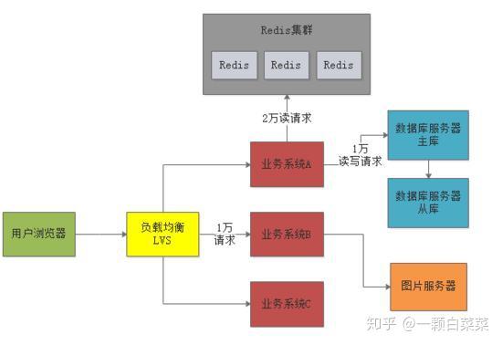 (6)分布式缓存扛下读请求 这个时候应用服务器层面一般没什么大问题,因为无非就是加机器就可以抗住更高的并发请求。 现在估算出来每秒钟是1万左右的请求,部署个二三十台机器就没问题了。 但是目前上述系统架构中压力最大的,其实是 数据库层面 ,因为估算出来可能高峰期对数据库的读写并发会有3万左右的请求。 此时就需要引入 分布式缓存 来抗下对数据库的读请求压力了,也就是引入Redis集群。 一般来说对数据库的读写请求也大致遵循28法则,所以每秒3万的读写请求中,大概有2.4万左右是读请求 这些读请求基本上90%都可以通过分布式缓存集群来抗下来,也就是大概2万左右的读请求可以通过 Redis集群来抗住。 我们完全可以把热点的、常见的数据都在Redis集群里放一份作为缓存,然后对外提供缓存服务。 在读数据的时候优先从缓存里读,如果缓存里没有,再从数据库里读取。这样2万读请求就落到Redis上了,1万读写请求继续落在数据库上。 Redis一般单台服务器抗每秒几万请求是没问题的,所以Redis集群一般就部署3台机器,抗下每秒2万读请求是绝对没问题的。如下图所示: