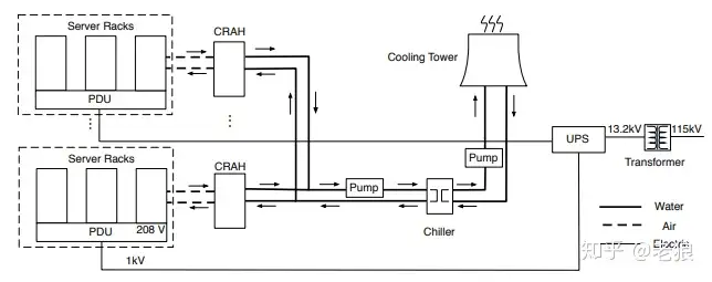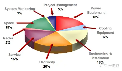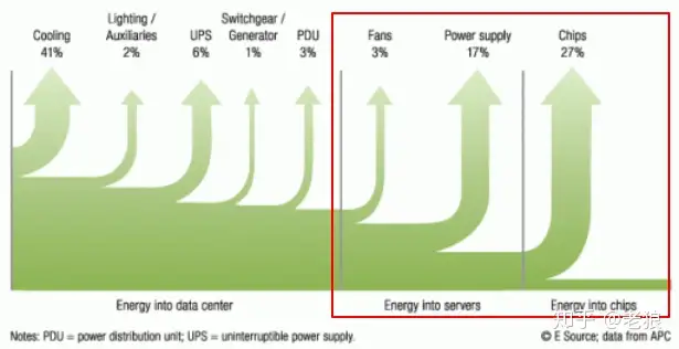 能源消耗大约只有47%的部分进入了服务器(红框部分),这才是有效的能耗。而41%的部分被散热消耗掉了! 一个典型的数据中心能源和散热构成如下:
