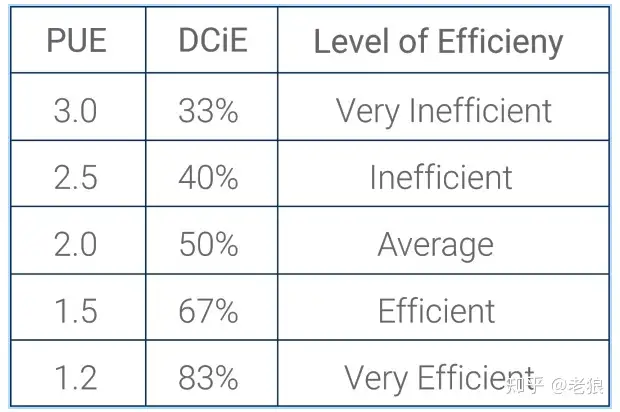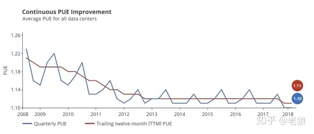 它在2012年PUE值就已经相当低了,这与它持续不断的优化是分不开的,这也是Google为了自己钱包考虑的必然之举,详情见参考资料1。Facebook则宣称在美国佛斯特及瑞典吕勒奥数据中心的PUE等级达到了1.06-1.08。PUE总体评级如下: