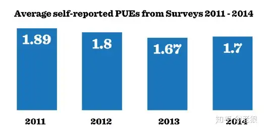 散热部分包括机架风扇,空调、泵机和散热塔。这些部分消耗的能源占据数据中心能源消耗的很大一部分,也在TCO中占据的很大的比重。 这里要提一下PUE。电能使用效率(PUE)是评价数据中心能源效率的指标,它的计算很简单: PUE = 总体能耗 / IT设备能耗 我们可以看出,PUE 值越接近于 1,数据中心的能源效率越高。我们一起来计算一下上个例子中PUE的值。 PUE = 1/0.47 = 2.12 这个数据怎么样呢?我们来看一下2011到2014美国平均PUE是多少:
