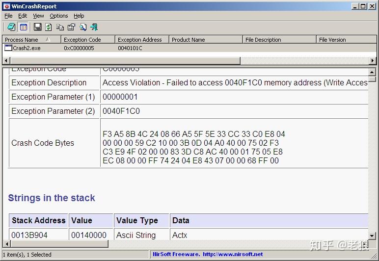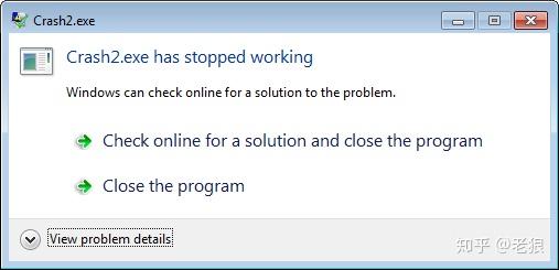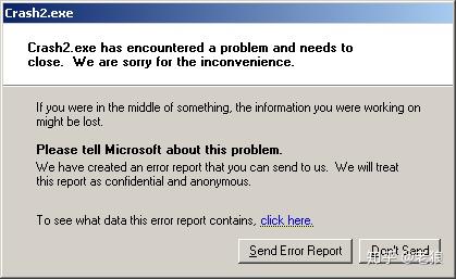 这个是什么原因?哈哈,是我为了debug一个驱动,手动生成的蓝屏,所以是MANUALLY_INITIATED_CRASH,就是为了生成minidump文件。 最后要说明的是这个程序支持几乎所有版本的Windows,从WinXP到Win10,IA32和X64。并有中文包。 WinCrashReport一般的应用程序遇到异常会被异常处理程序捕捉,如果程序的异常处理没有做好,系统的异常处理程序会弹出熟悉的画面: