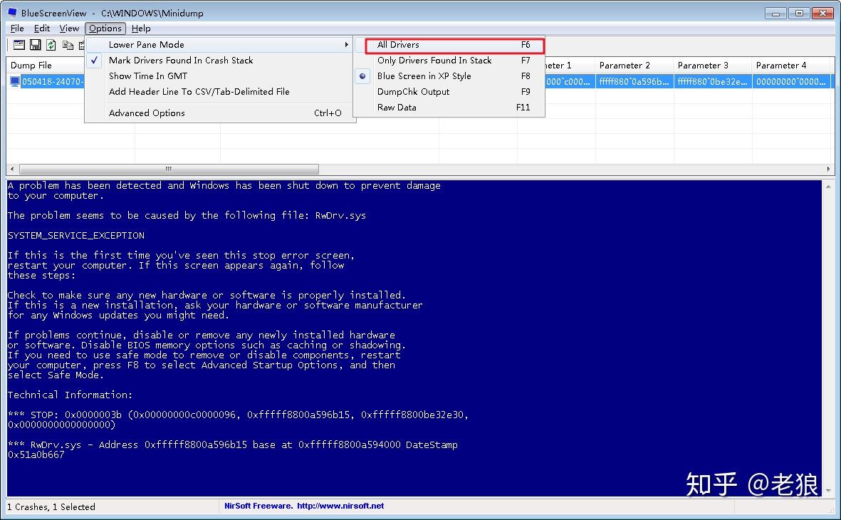 窗口上半部分是在缺省位置找到的所有的minidump文件,下半部分是模拟的蓝屏信息。我们可以看到是RwDrv.sys 驱动造成的stop code为0x3b(SYSTEM_SERVICE_EXCEPTION)的蓝屏。注意这里的窗口内容都可以剪贴的复制。 我们可以选择“All Drivers”形式,可以看到更多内容: