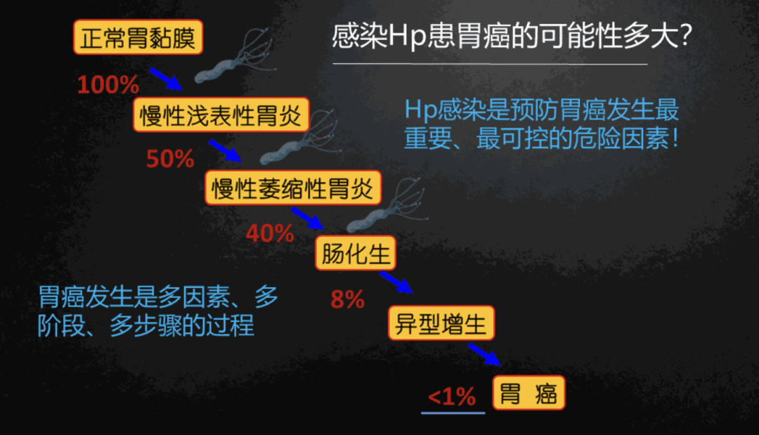 但我们要强调的是,即便感染了幽门螺杆菌,也完全不用慌,因为距离癌症还是有很远的距离。根据目前的临床统计,100个感染Hp的患者中,最后能发展促成胃癌的比例并不到1%。