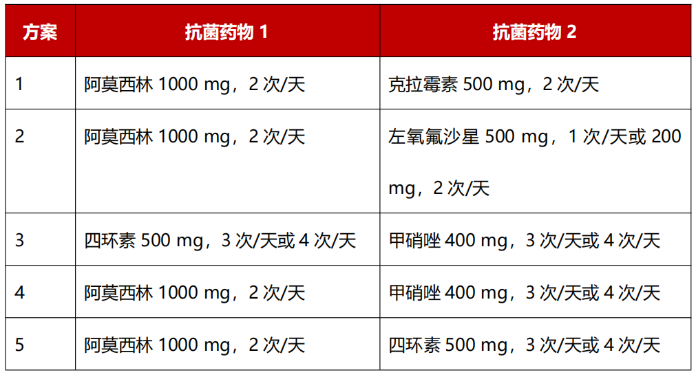 根据最新版国六共识中的用药建议,目前还是推荐含铋剂和质子泵抑制剂的四联方案,其中的两联抗生素优先在下面几种组合和推荐量中进行挑选。【9】【10】