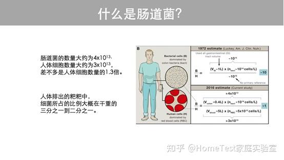 肠道菌的定义非常简单,字面理解就是肠道中存在的细菌。当然肠道中还有不少的真菌和病毒,这些不在我们今天讨论的范围以内,我们平常所说的细菌一样,肠道细菌同样是体积很小,以至于肉眼看不到。但是这并不代表他们不存在,相反呢,肠道菌的数量多的惊人,关于肠道菌的准确数量,之前认为是十的四次方,是人体细胞的十倍,现在的最新科学研究表明,可能是人体血液细胞数量的1.3倍左右,而人体粪便的干重中,细菌的比例占到三分之一到二分之一,这个比例是非常吓人的,相当于肉眼可见的粑粑中有一小半都是细菌,或者是细菌的尸体或者代谢物。
