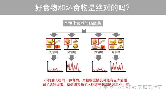 好食物和坏事物是绝对的吗,我们习惯用血糖生成指数,也就是GI指数来评估食物是否容易发胖,或者是对血糖的影响,一种食物的GI数值一般都是固定的,比如香蕉的GI数值是52,对于绝大多数人都是这样的,但是这样不够精准,有些人吃了香蕉之后,血糖生成是比其他人慢,而有些人甚至对蛋糕或者点心之类碳水比较高的食物。血糖相应也会比较小,这就是特定人群体内的肠道菌在发挥作用,肠道菌代谢这些碳水物质比较慢,如果专门监测每个个体的肠道菌情况,配合血糖生成的情况监测,就能够真正的做到个体化营养。这也许是为了营养学的一个方向之一。