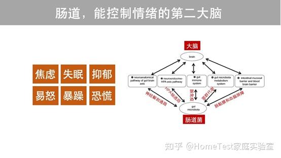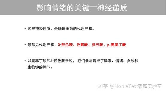 影响情绪的关键主要是通过神经地址来完成的,肠道菌每天在肠道里面吃了睡,睡了吃,当然不是白吃白喝。它们会生成大量的代谢产物来报答肠道,给他们提供食物。而这些代谢产物中就包含大量的,会影响到我们大脑功能的神经递质。有大家非常熟悉的5-羟色胺,多巴胺, 5-羟色胺和氨基丁酸,这类的物质。与我们的情绪,睡眠,食欲,生物钟的调节都有非常密切的关系。