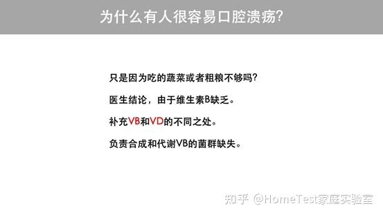 进行了肠道菌的检测,他的肠道菌检测结果显示,合成维生素B的肠道菌非常少,他负责消耗维生素B的一些,拟杆菌群种含量很高,这就造成了维生素B合成严重不足,还要被大量消耗,维生素B和维生素D的补充方式是不一样的,维生素D体内无法合成,因此需要通过外界补充才可以。而维生素B呢,正好相反,人体内的一些细菌,比如青春双歧杆菌或者粪肠球菌等细菌。是可以不断的合成维生素B的,如果缺乏这些益生菌,又不爱吃膳食纤维,或者是维B含量高的蔬菜,口腔溃疡容易复发。