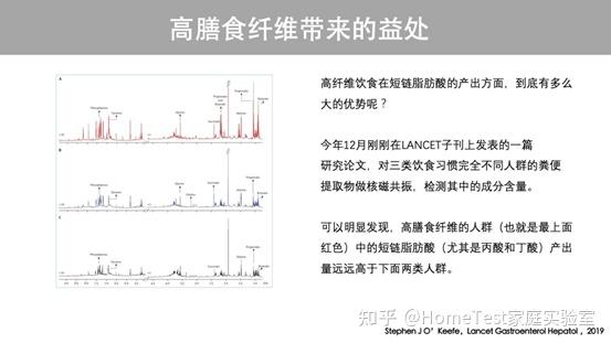 有人可能会问,那么高纤维饮食在健康贡献方面到底有多么大的优势呢,今年12月刚刚在Lancet子刊上发表的一篇研究论文,对三类饮食习惯完全不同的人群,粪便提取物进行检测,结果表明,在高膳食纤维的人群,也就是最上方红色的,这个组,他的短链脂肪酸产出量远远高于下面两类,西方饮食的人群,高膳食纤维的人群的短链脂肪酸,尤其是丙酸和丁酸,这两类脂肪酸都是非常健康的短链脂肪酸,他们的高含量,是对人体的健康有非常大的贡献的。