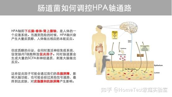 脑-肠之间还有一个重要的通路是HPA轴,也就是下丘脑垂体和肾上腺轴,人感到压力或者紧张的情况下,会导致皮质醇的大量释放,这样就会影响到我们肠道的应激反应,他会使得肠壁的T细胞释放大量的促炎因子,同时,肠道菌也会释放短链脂肪酸和其他的神经递质,通过我们的血脑屏障,进而会去影响我们的大脑反应,还有一部分炎症因子会通过其他的信号通路,到达皮肤的皮脂腺,这就是引起皮肤痤疮的问题,
