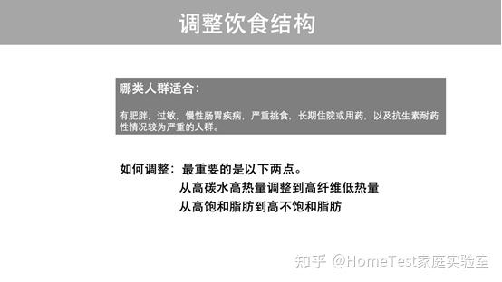 首先,我们来说,调整饮食结构,如果有肥胖,过敏,挑食或者有住院经历的人群,很可能肠道菌的检测结果会显示进群结构不合理,比如厚壁菌门的比例过高,或者拟杆菌门的比例过高,或者变形菌门的总体含量超过健康人的比例,这时候就一定要考虑优先调整饮食结构,从高热量,低纤维的饮食调整为高纤维,低热量。减少日常猪牛羊等饱和脂肪酸的摄入,改为类地中海式的饮食结构,等高不饱和脂肪酸结构,这样可能尽快地减少隐隐热因子的释放,帮助菌群重新回到正常的水平。